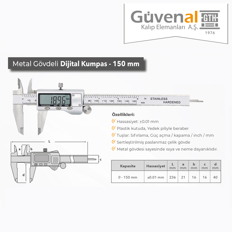 Güvenal Metal Gövdeli Dijital Kumpas - 150 mm